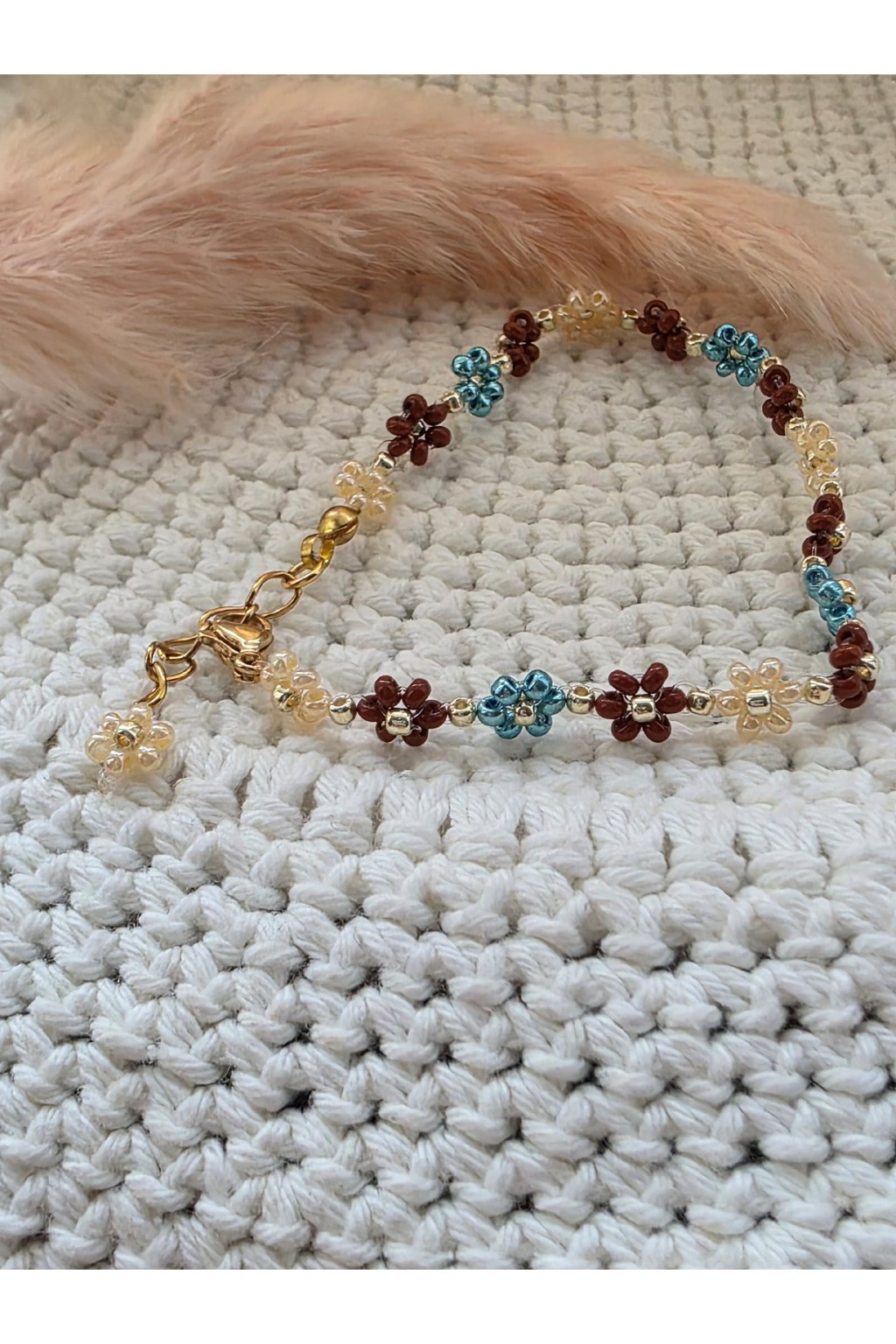 Náramek z jemných květin ve v barevné paletě roku 2025 Mocha Mousse se zlatými středy. Lahodné tóny kakaa, čokolády a kávy, snoubící se s azurovou modří moře..Nechte se unést pocitem pohodlí, intimity a elegance.